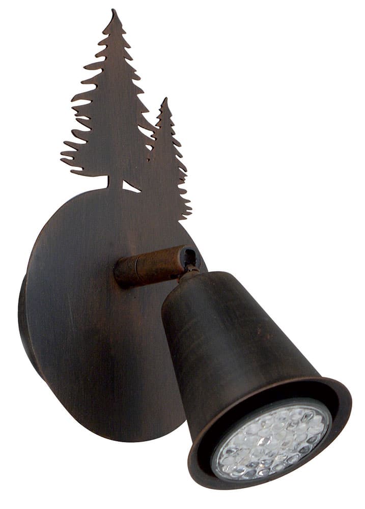 La structure de cette applique spot Sapins est en métal patiné de couleur marron et les éléments décoratifs en forme de sapins sont découpés au laser.