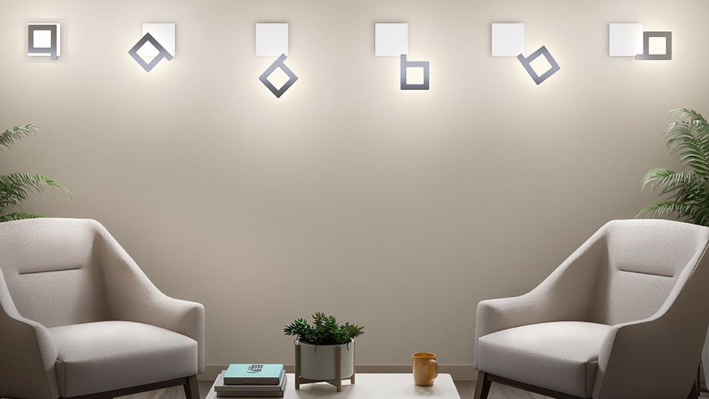 Une lumière indirecte digne d’un tableau lumineux sur le mur. La partie centrale en forme de “Q” pivote pour donner un look différent à cette applique. (voir photo)