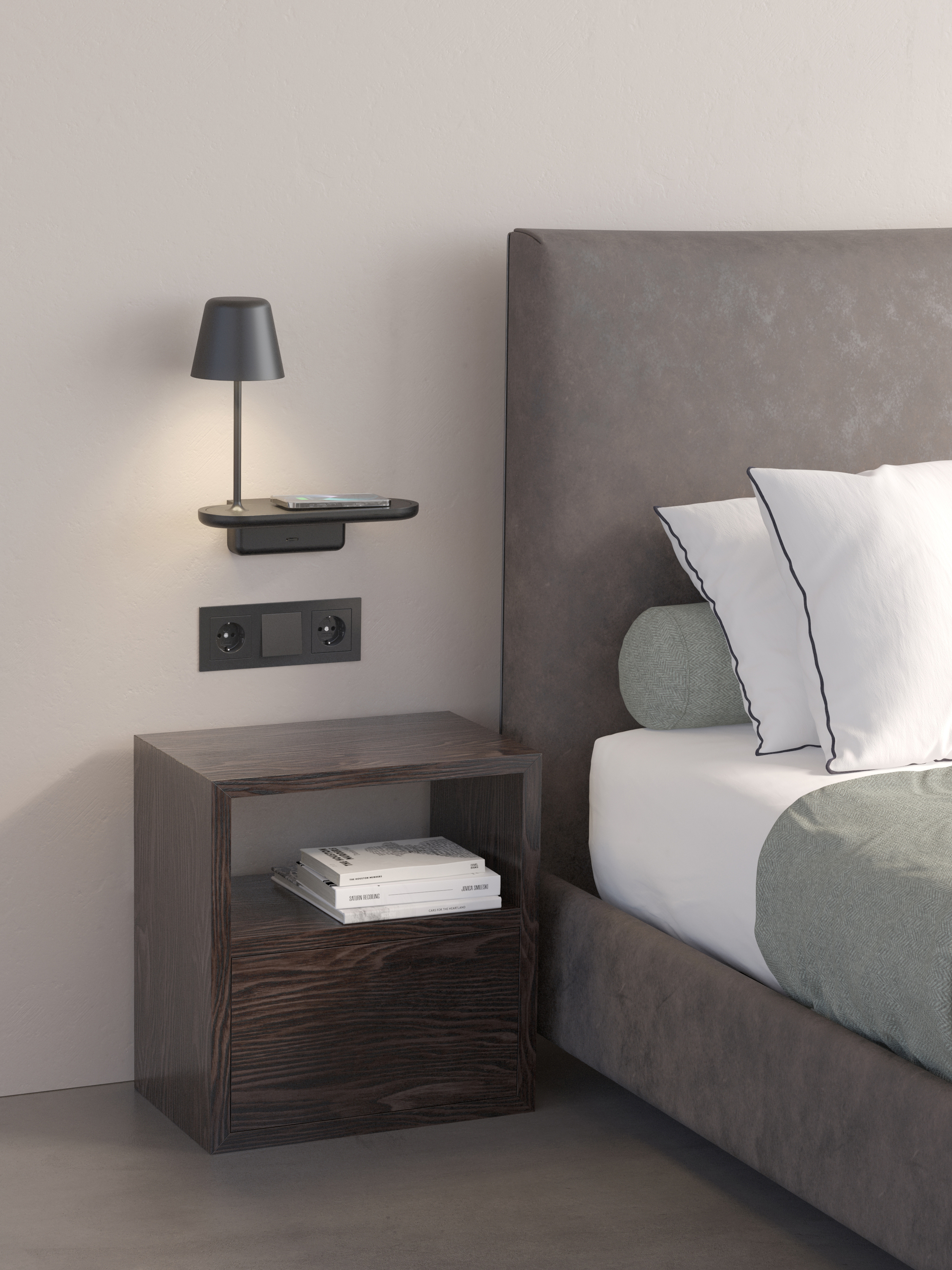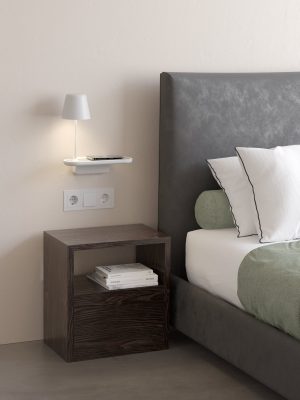 Son plateau intégré permet de poser un téléphone, un livre ou de petits objets, comme une table de nuit miniature. Cette applique est idéale dans une chambre à coucher, que ce soit en usage domestique ou dans un projet hôtelier.