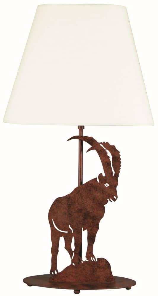 La structure de cette lampe Bouquetin 1L est en métal patiné de couleur rouille et les éléments décoratifs en forme de bouquetin sont découpés au laser.
