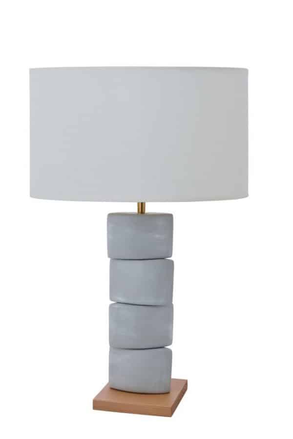 La lampe à poser Chanela TL EC est en céramique effet béton et bois naturel. L’abat-jour est en lin naturel.