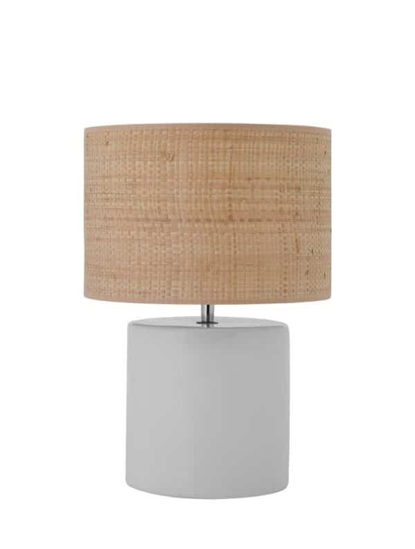 La lampe à poser Cyli TL LS est en céramique blanc brillant. L’abat-jour est en raphia.