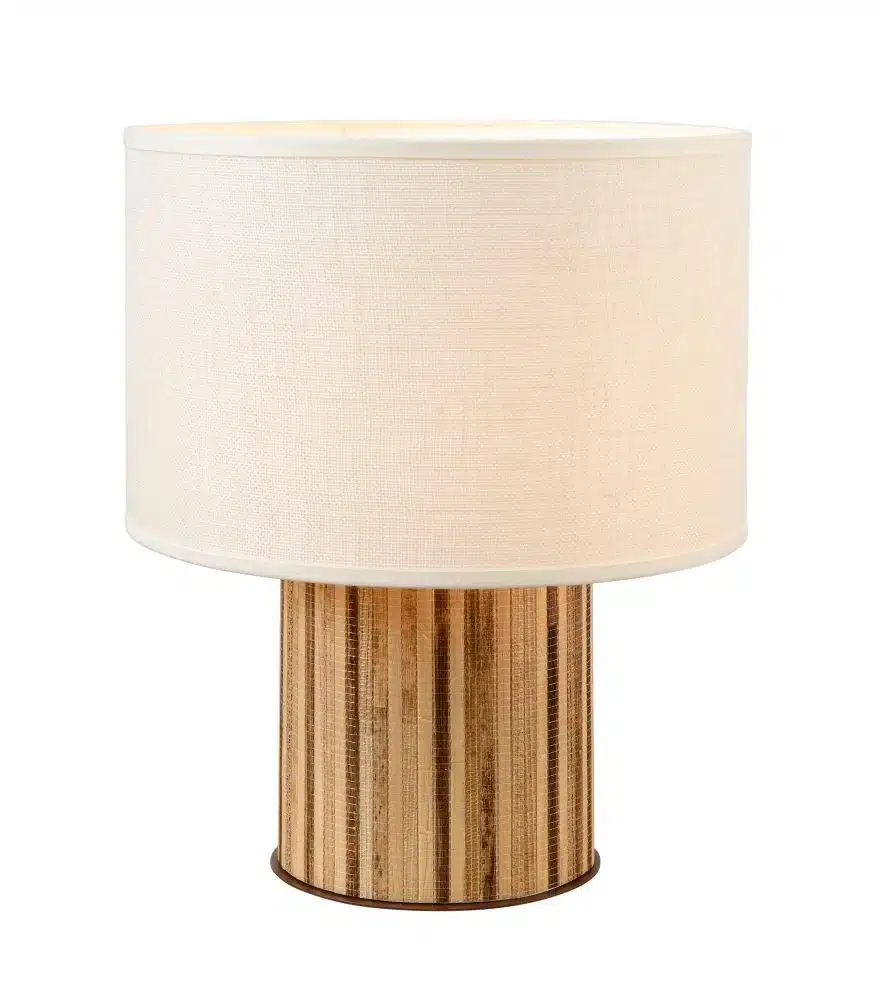 Cette lampe au style Bohême possède un pied en écorce de tige de nénuphar et un abat-jour en tissu blanc.