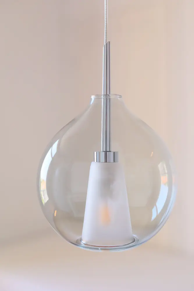 Il est également possible d’installer cette suspension Circé 1l transparent de part et d’autre de votre lit, afin de créer une lumière de chevet aérienne et décorative.