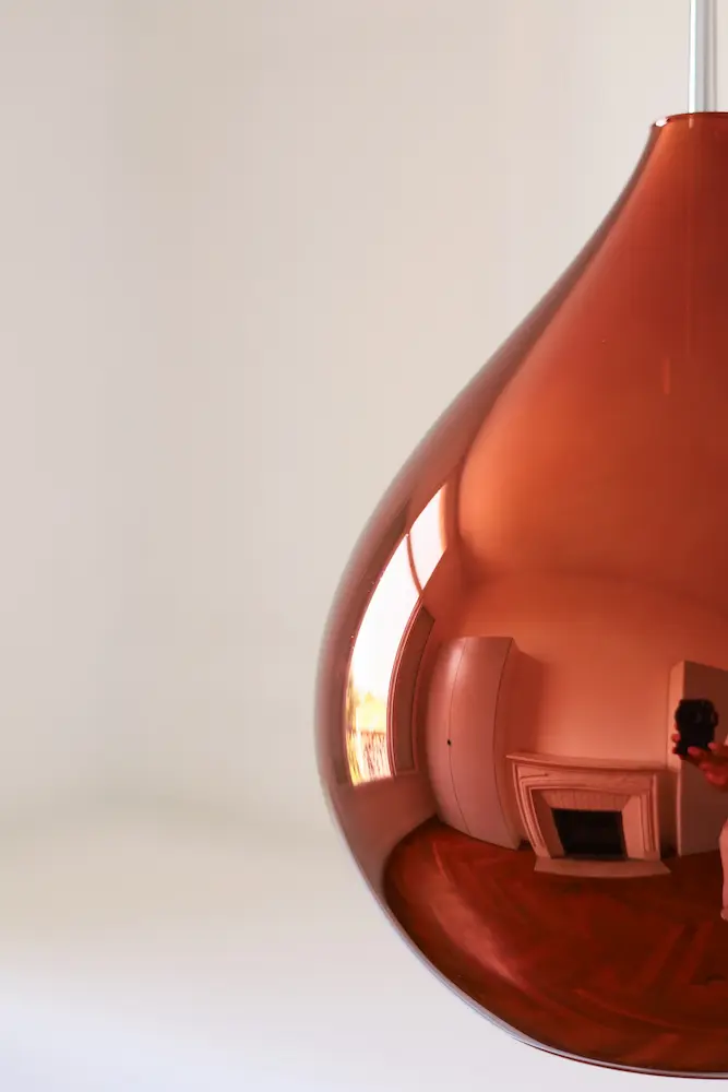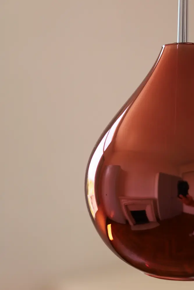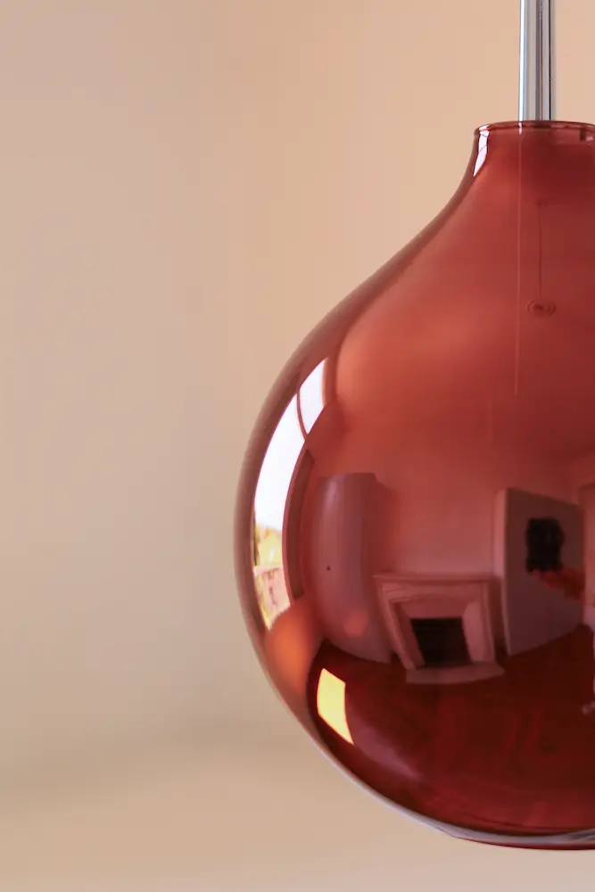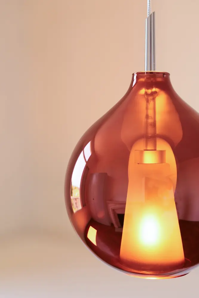 La finition à l’argenture de cette verrerie couleur cuivre grenat est un procédé unique qui donne un effet miroir lorsque l’ampoule est éteinte.