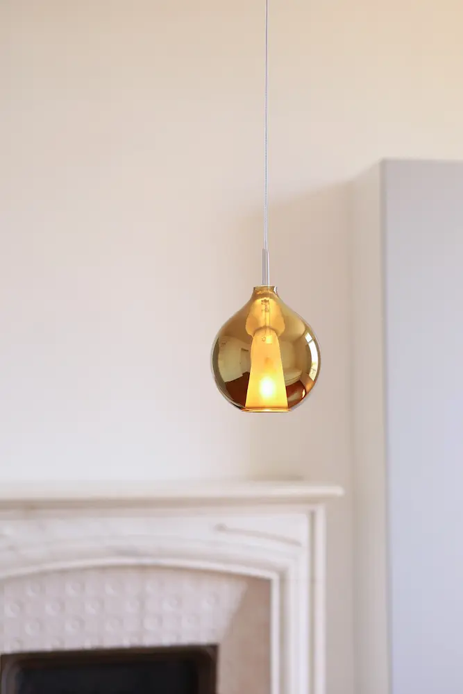 La finition à l’argenture de cette verrerie couleur or fumé est un procédé unique qui donne un effet miroir lorsque l’ampoule est éteinte.