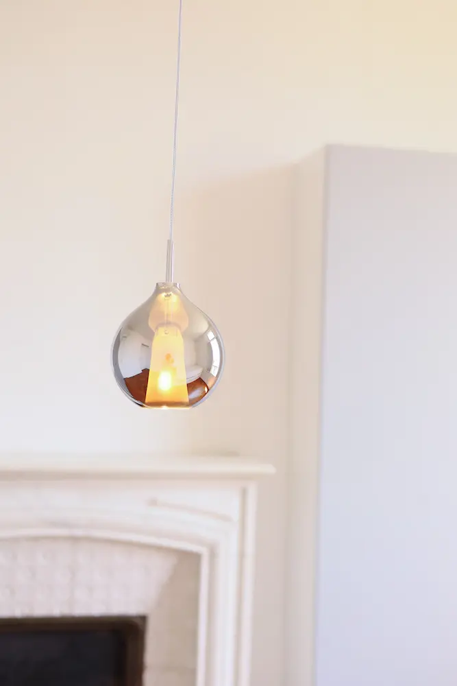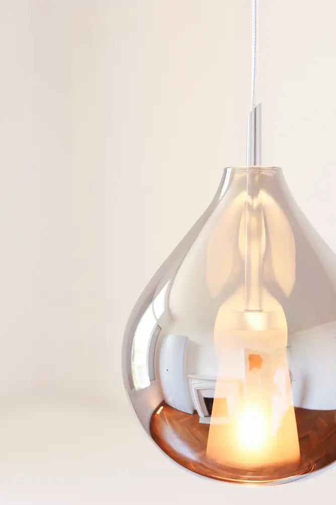 La finition à l’argenture de cette verrerie couleur smoky chrome est un procédé unique qui donne un effet miroir lorsque l’ampoule est éteinte.