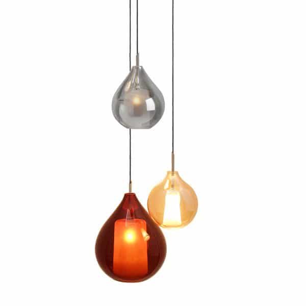 Ici, la suspension est présentée avec des verreries cuivre, ambre et smoky.