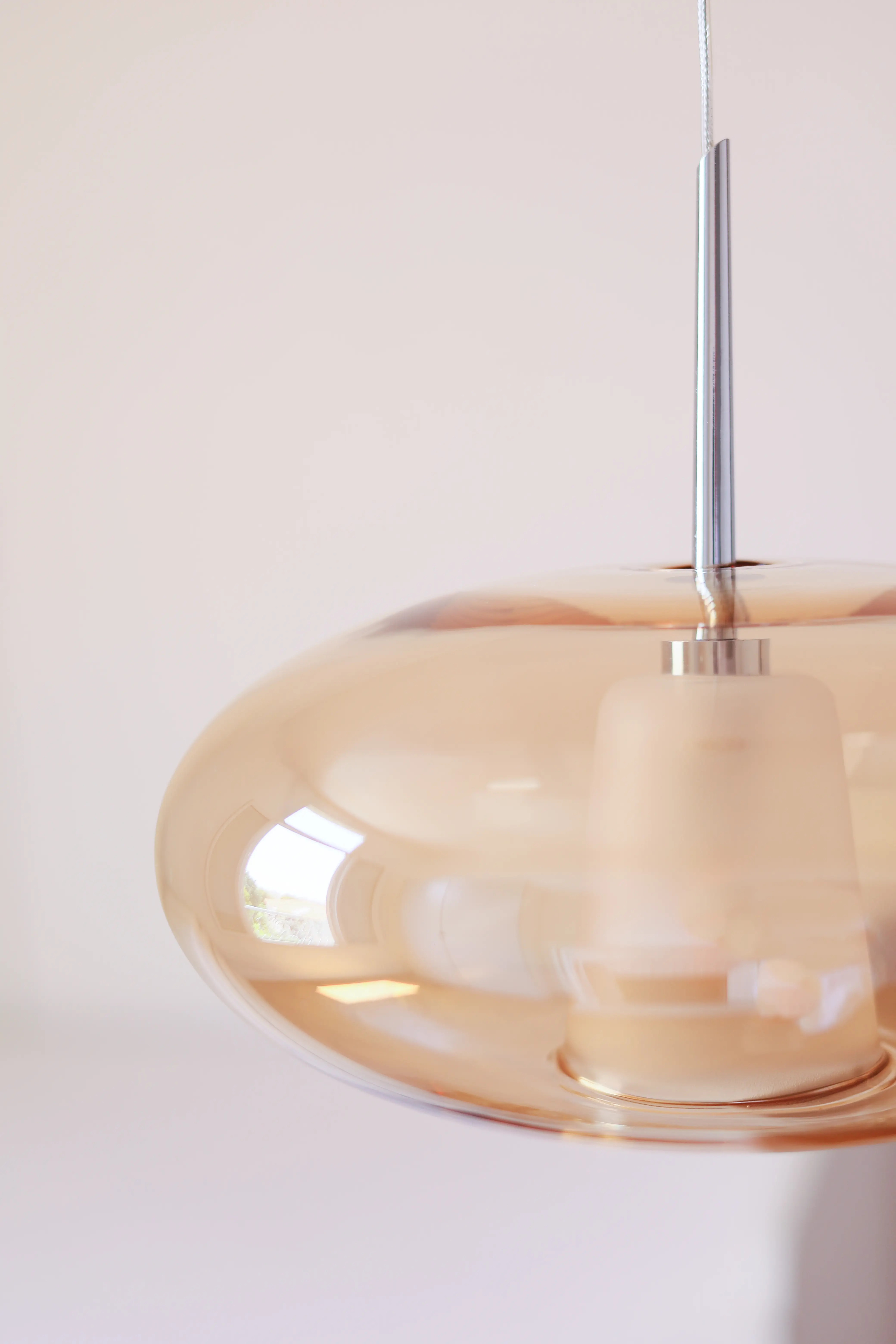 Cette suspension Fantasia ambre est composée d’un pavillon en métal d’un diamètre de 9cm disponible en plusieurs coloris : chromé avec un effet miroir, acier brossé, blanc mat, noir mat, laiton brossé…