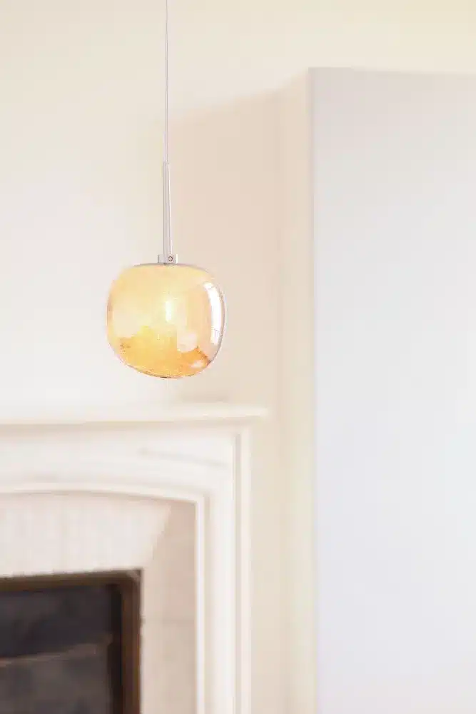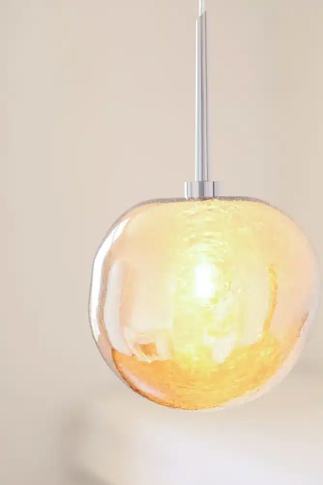 En verre soufflé à la bouche, cette verrerie est de couleur chrome avec des filaments visibles lorsque l’ampoule est allumée.