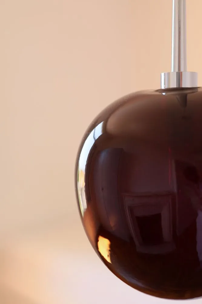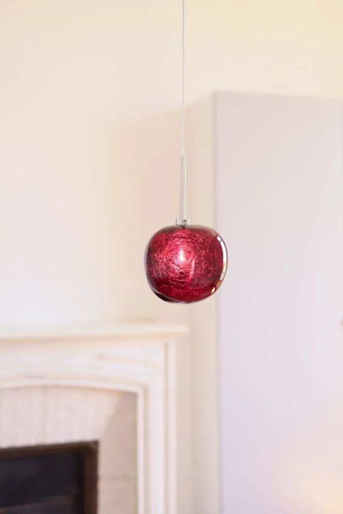 En verre soufflé à la bouche, cette verrerie est de couleur rouge avec des filaments visibles lorsque l’ampoule est allumée.