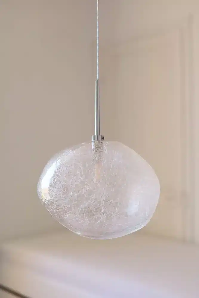 En verre soufflé à la bouche, cette verrerie est transparente avec des filaments visibles lorsque l’ampoule est allumée.